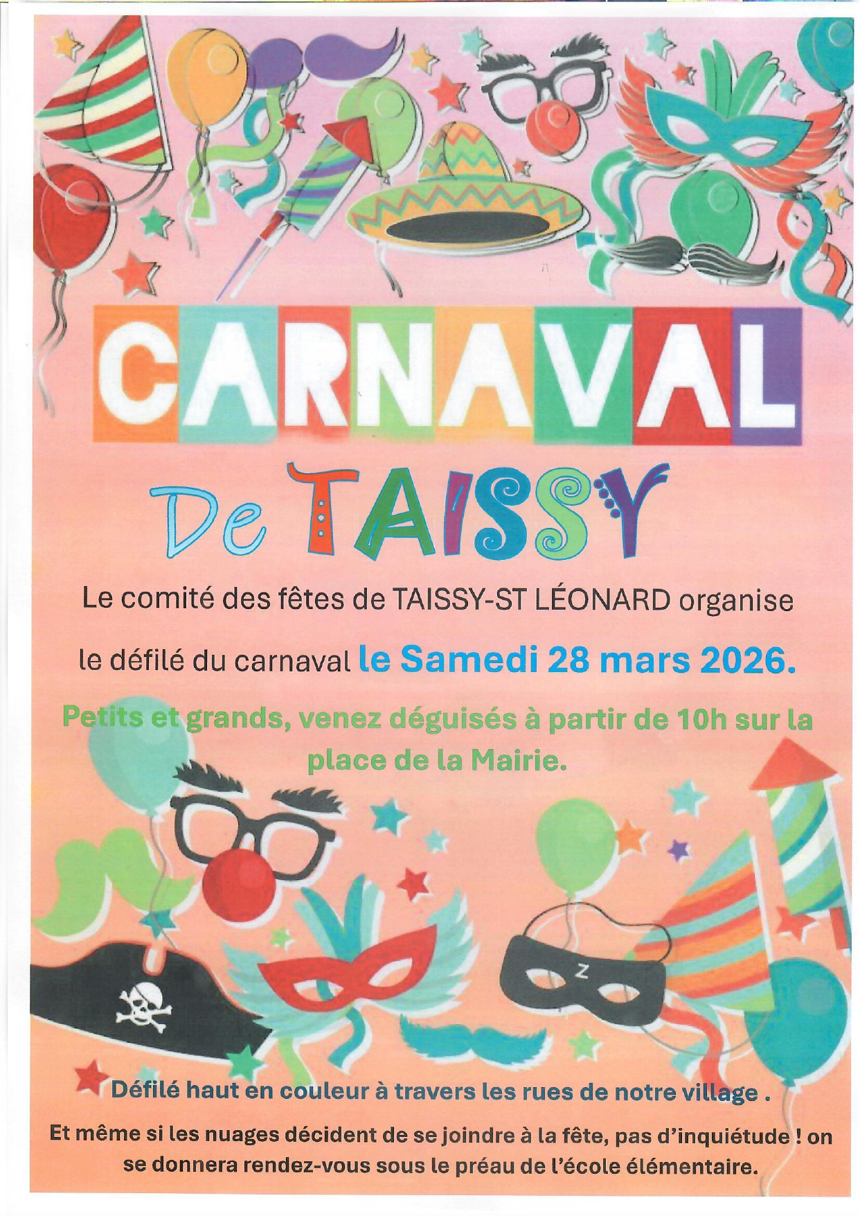 Le comité des fêtes organise le défilé du carnaval de Taissy le Samedi 28 mars 2026. Petits et grands, venez déguisés ! RDV à 10h sur la Place de la Mairie pour le début des festivités. Défilé haut en couleur à travers les rues de notre village...
