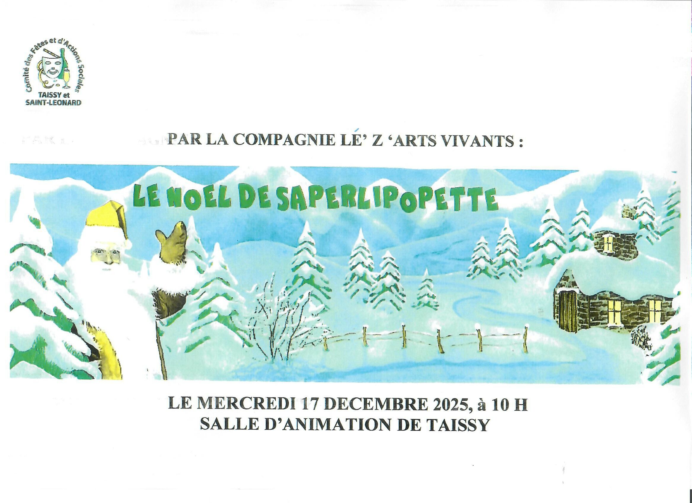 Le Comité des Fêtes vous convie au spectacle de Noël le mercredi 17 décembre à 10h00 à la salle d’animation de Taissy. L’entrée est gratuite pour tous les enfants de Taissy et Saint-Léonard. Ne manquez pas ce moment magique en famille !