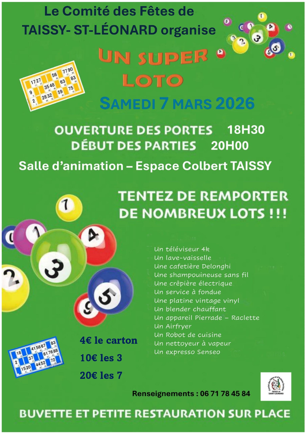 Le Comité des Fêtes organise un super loto le samedi 7 mars 2026 dans la salle d'Animation de l'Espace Colbert de Taissy. Ouverture des portes à 18h30, début des parties à 20h00. De nombreux lots à gagner : un téléviseur 4k, un lave-vaisselle, ...