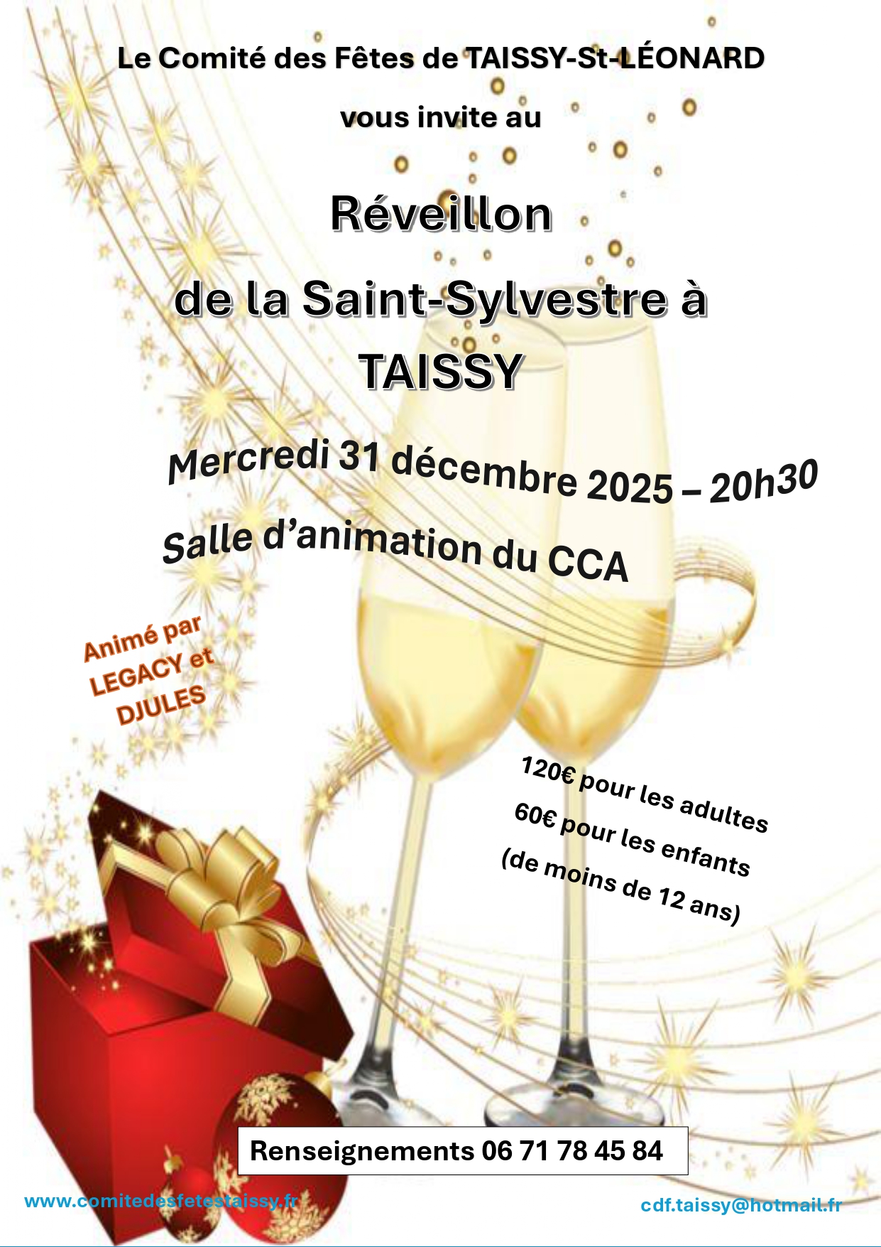 Le Comité des Fêtes de TAISSY-St-LÉONARD vous convie à la soirée inoubliable du Réveillon, le 31 décembre 2025 à 20h30, au CCA de Taissy (Salle d’animation). Plongez dans une ambiance festive assurée par LEGACY et DJULES !