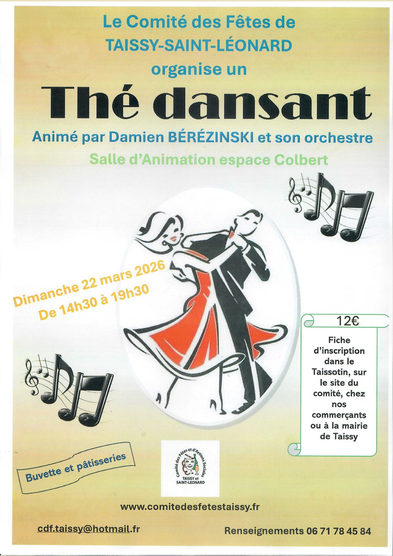 Participez au thé dansant le dimanche 22 mars 2026, de 14h30 à 19h30, au CCA de Taissy (salle d’animation), animé par Damien BEREZINSKI et son orchestre, organisé par le Comité des Fêtes de Taissy-Saint-Léonard.